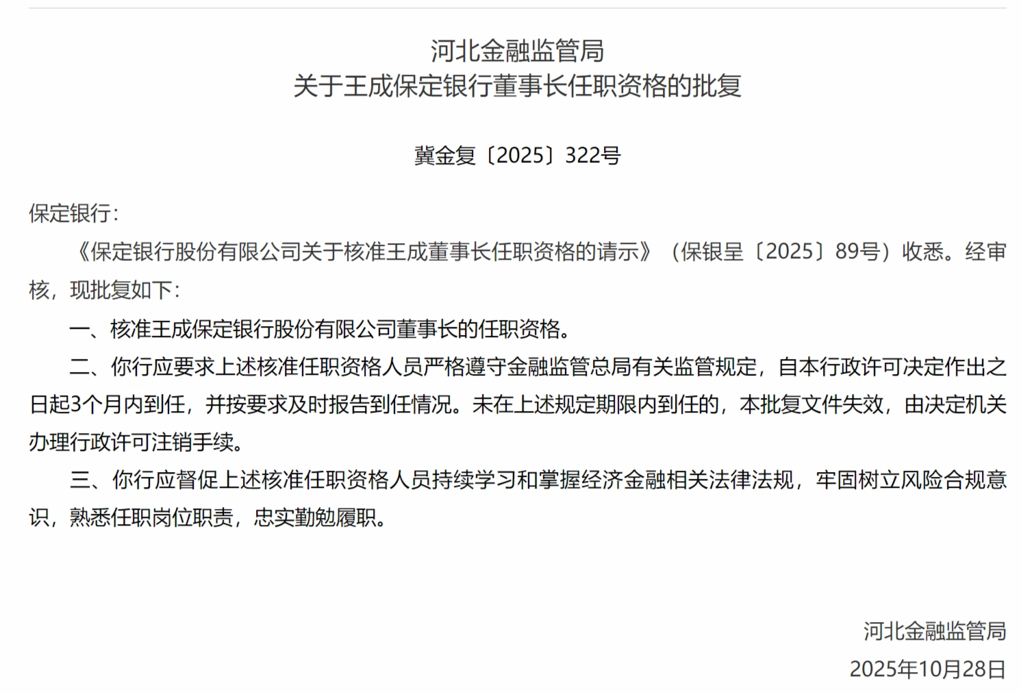 10月30日,河北金融监管局发布关于王成保定银行董事长任职资格的批复,核准王成保定银行股份有限公司董事长的任职资格。